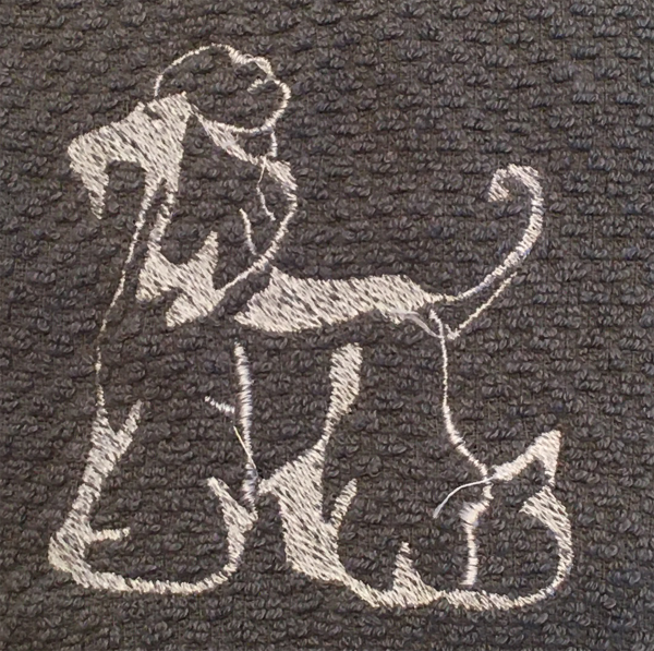 Embroidered Kitchen Towel - Gray towel embroidered with white Marcia VanWoert stacked image.